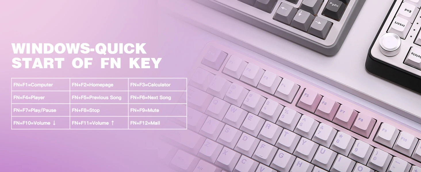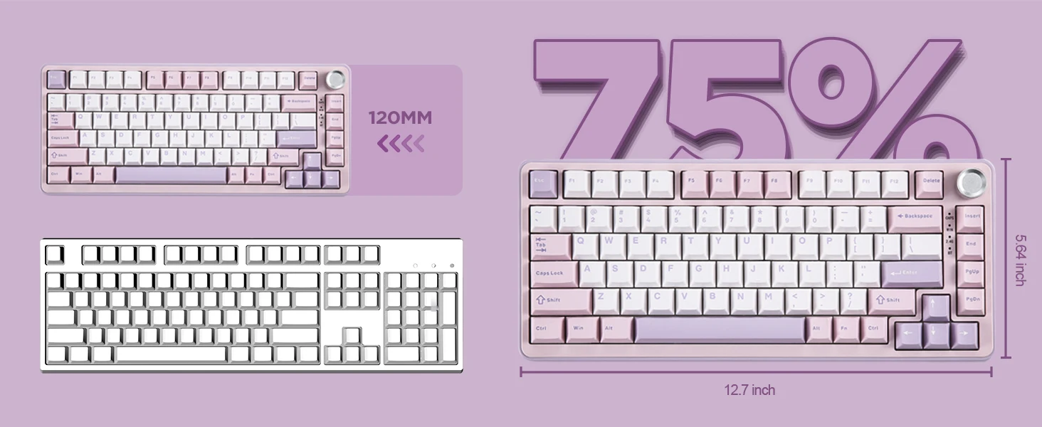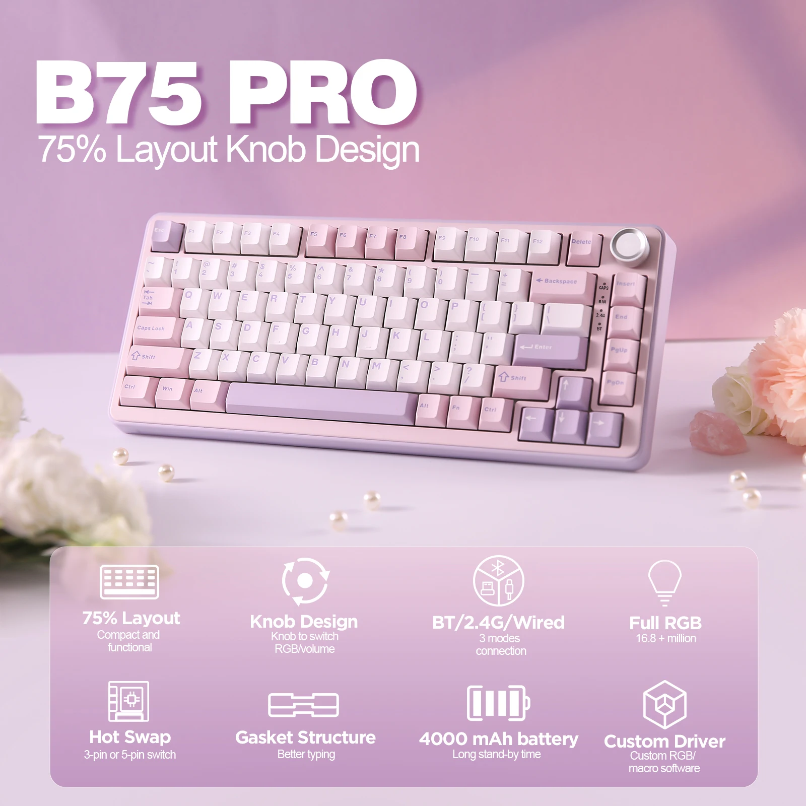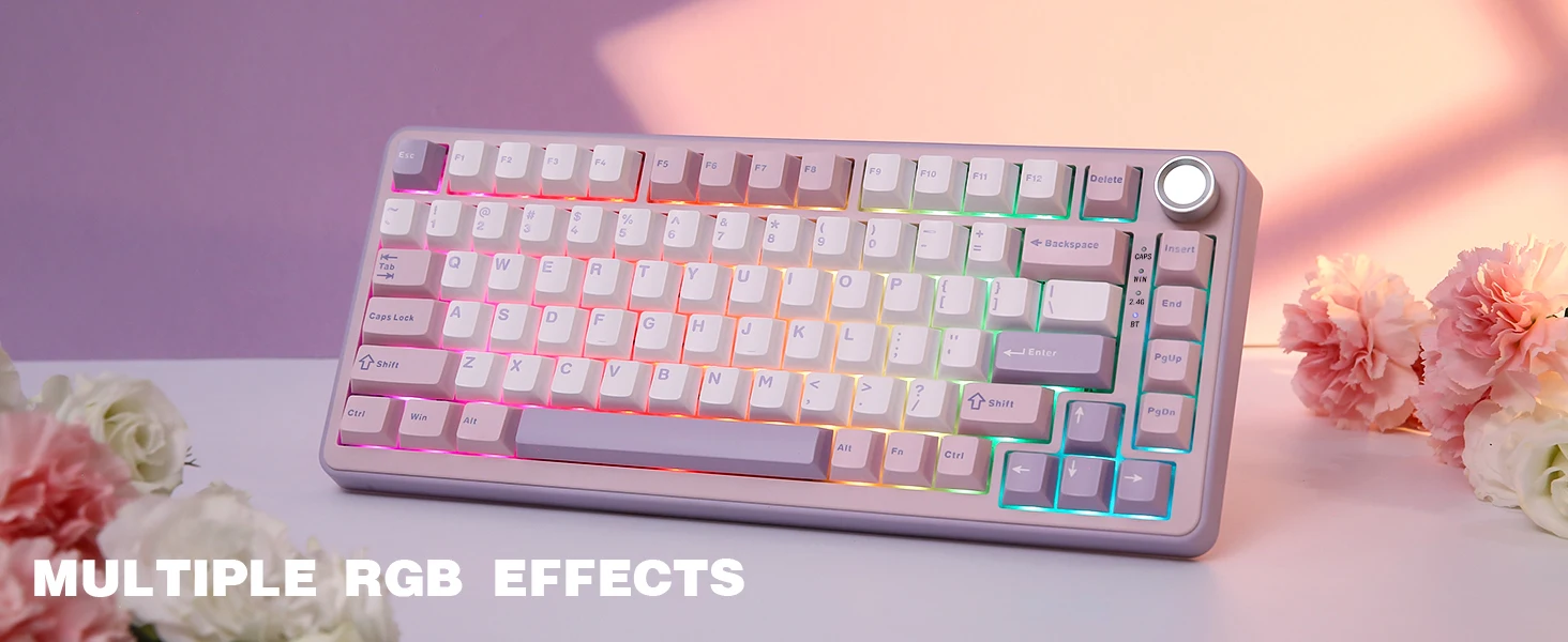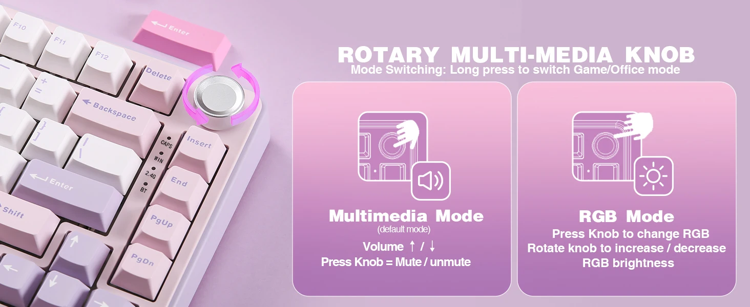 B75 PRO is a compact keyboard with a knob and 82 keycaps. The TKL keyboard has number keys, function keys, and arrow keys at the same time. The multi-function knob of the 75% gaming keyboard enables you to adjust the sound level and backlit fast. Long press the multifunctional knob of this RGB keyboard can switch between gaming and office modes, rotate the knob to adjust the keyboard volume and RGB backlit effects.