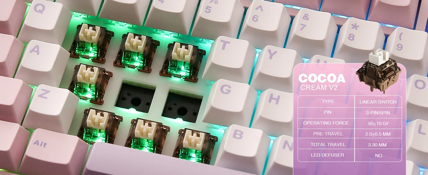 The creamy keyboard is designed with the most advanced gasket keyboard structure. With 5-layer padding, noise cancellation design, double shot keycaps, precision-tuned stabilizers, and pre-lubricated mechanical switches, this linear keyboard provides a virtually creamy-sounding keyboard typing experience and a solid typing feel.